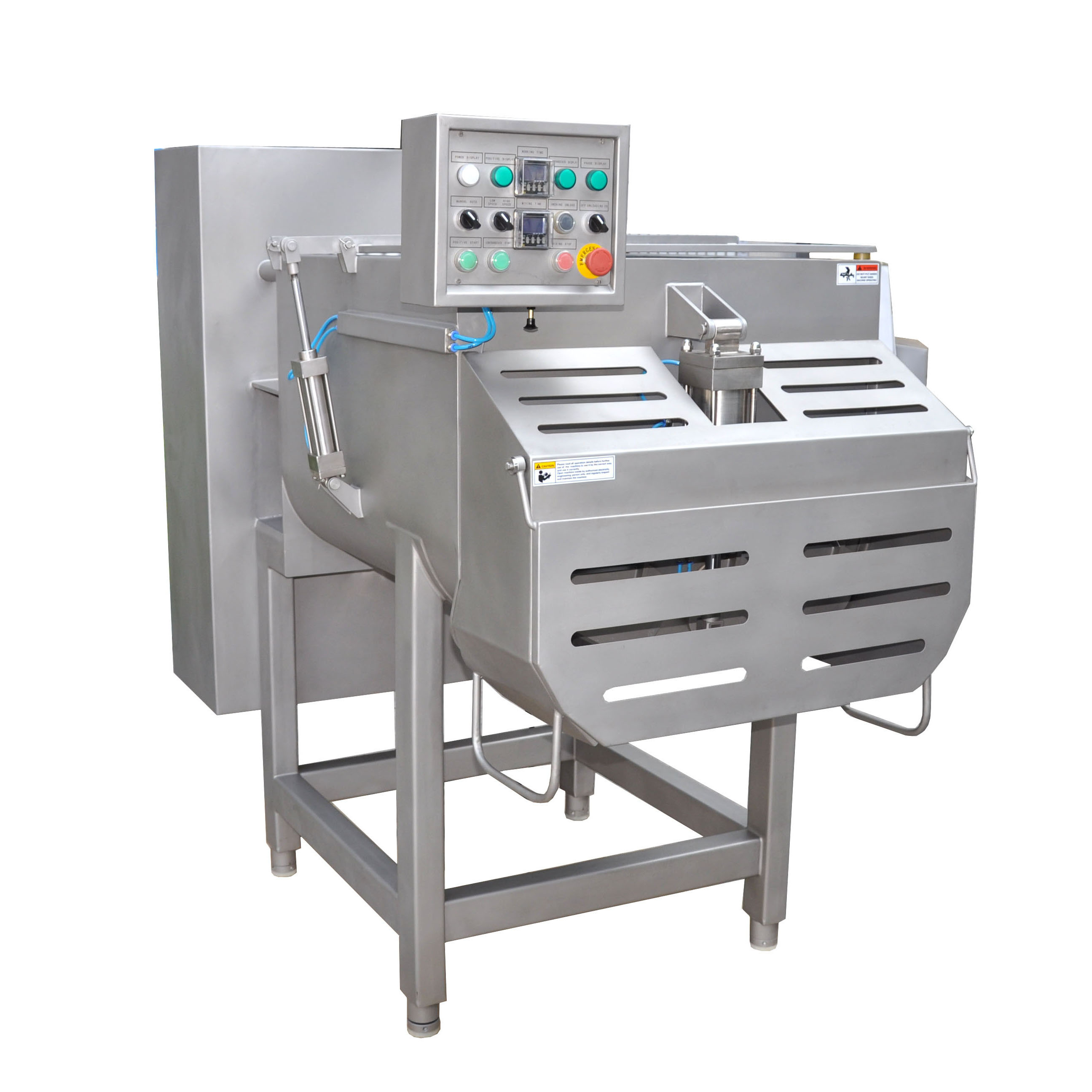 整机由优质不锈钢SUS304制造。BJBJ-750搅拌机为双轴搅拌,设有正反转和暂停时间装置,挤压式推进,气动出料,上盖及出肉口均装有安全保护装置。不同的搅拌浆叶可根据用户需求提供。